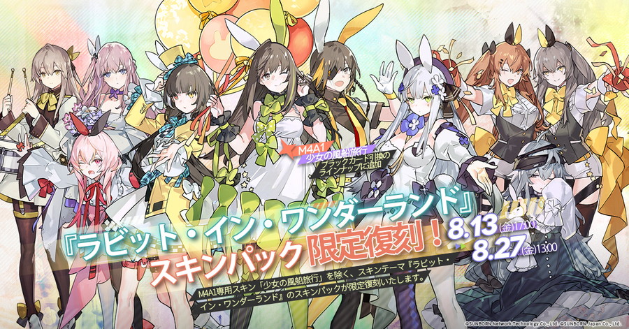 2周年記念のドレススキン『仲夏の幻想』が「8月13日17:00」より期間限定で復刻する。また、同日よりAR小隊と404小隊がウサギ姿で勢揃いした『ラビット・イン・ワンダーランド』のスキンパックも期間限定でショップに登場する。過去のイベント報酬で獲得可能だった、M4A1専用スキン「少女の風船旅行」はブラックカード引換のラインナップに追加するので、揃えて使用してほしい。