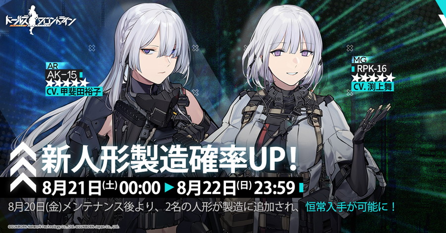 サンボーンジャパンは、『ドールズフロントライン(「ドルフロ」)』において、8月20日より新たな人形2名の追加と、それに伴う確率UPイベントの開催について発表した。さらに、豪華声優陣による多数のキャラクターボイスの追加についても合わせて発表した。