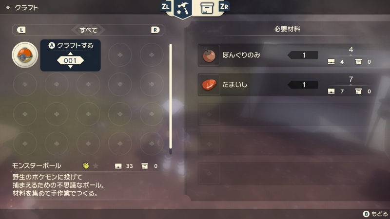 クラフトで作った道具も、ポケモンの捕獲に役立てることができる。「めかくしだま」を使って身を隠したり、「ヘビーボール」で主人公に気づいていないポケモンを捕まえたりと、工夫次第で捕獲を有利に進めることができるようになる。