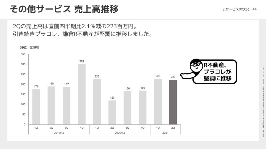 引き続きプラコレ、鎌倉R不動産が堅調に推移した。