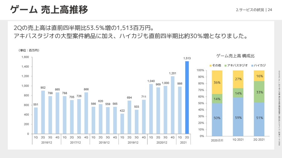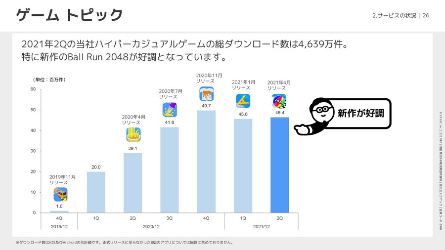 ゲームの開発体制は、カヤックから子会社のカヤックアキバスタジオにシフトした。アキバスタジオでは、ゲームに加えて、アニメ・エンタメ領域の受託開発を拡大している。アキバスタジオの受託で大型案件が計上されたほか、ハイパーカジュアルゲームの売上もQonQで3割の伸びとなるなど好調だった。ハイパーカジュアルゲームは『Ball Run 2048』が貢献した。
