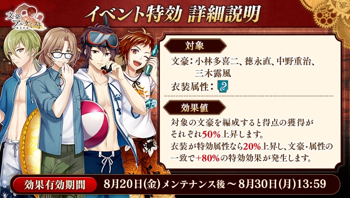 期間中「小林多喜二」「徳永直」「中野重治」「三木露風」の衣装を編成して潜書すると、 得点の獲得数がそれぞれ50%上昇する。 さらに、 「水」属性の衣装を編成して潜書すると、 得点の獲得数がそれぞれ20%上昇する。イベントと同時に開催される限定召装「真珠島ノ冒険」では、 「小林多喜二」「徳永直」「中野重治」の「水」属性の衣装を一定の確率で獲得できる他、 交換所で思念素と交換することで入手できる。