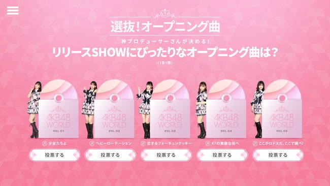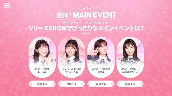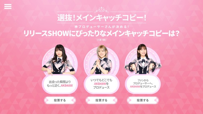 プレイヤーは、 今後開催される「AKB48 WORLDリリースSHOW」の5つのイベント内容を投票し、 その結果によりリリースSHOWの内容が決定する。 さらにリリースSHOW投票に参加した人の中から、 抽選で招待券及び限定グッズなど様々なプレゼントを提供する。 ゲームもリリースSHOWもあなたの選択によって変わっていく、 そんなプロデューサー体験を楽しもう。