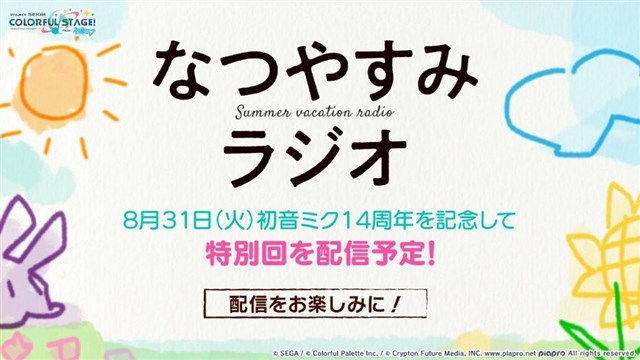 各ユニットにて毎日配信中の「なつやすみラジオ」の8月31日配信回は、初音ミク14周年を記念して特別回を配信する。8月31日19時より、『プロジェクトセカイ』公式YouTubeチャンネルにて配信予定。
