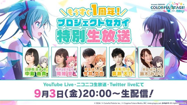 9月30日の『プロジェクトセカイ』1周年を記念して、9月3日20時より「もうすぐ1周年!プロジェクトセカイ特別生放送」の配信を決定した。1周年に向けて特別な情報をたくさんお届け予定。