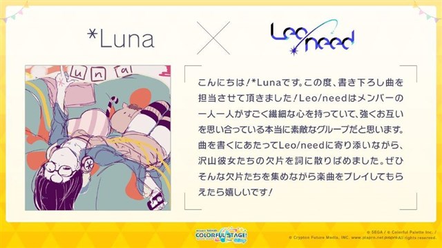 『プロジェクトセカイ』書き下ろし楽曲提供クリエイターとして、*Lunaさんとピコンさんが参加することが決定した。*Lunaさんには「Leo/need」、ピコンさんには「25時、ナイトコードで。」のユニット楽曲を提供する。今後、両楽曲ともにリズムゲーム楽曲として追加予定。詳細情報の公開をお楽しみに!