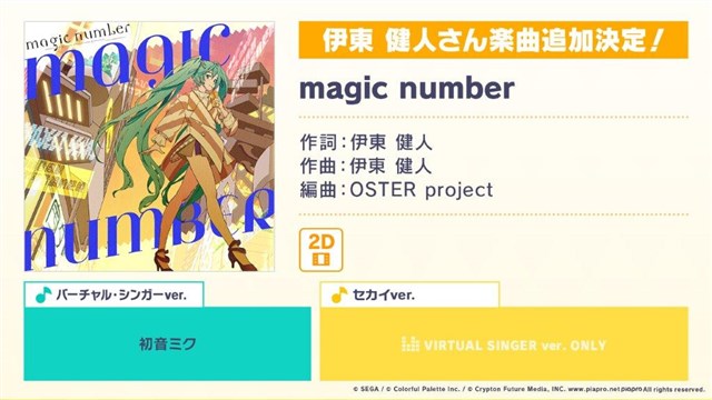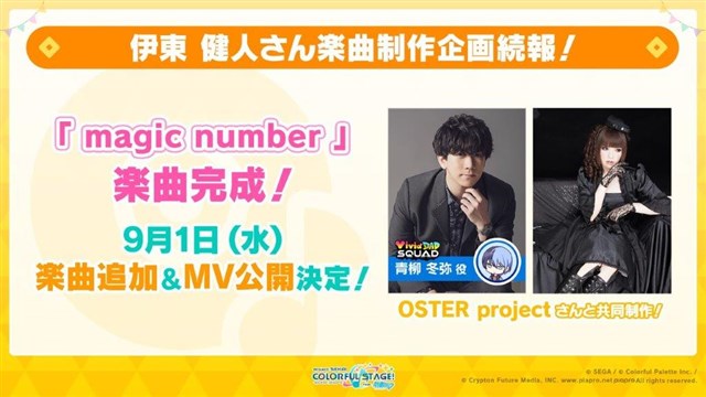 青柳冬弥役の伊東健人さんが楽曲制作した「magic number」を、9月1日にリズムゲーム楽曲としてゲーム内に追加する。初音ミクが歌うバーチャル・シンガーver.の音源でプレイが可能。また、2DMVも公開予定。