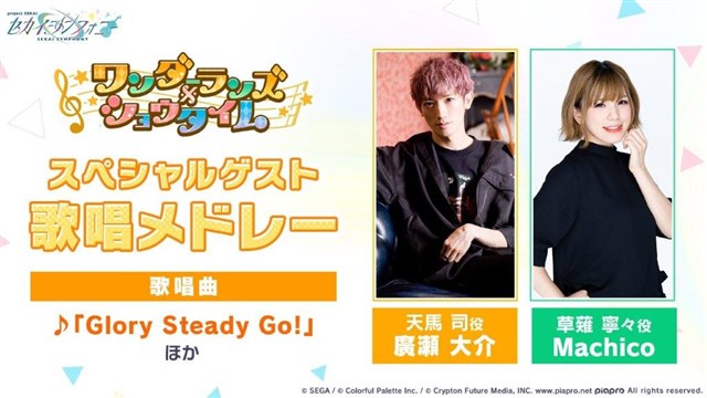 『プロジェクトセカイ』初のオーケストラコンサート『セカイシンフォニー』は、10月16日にパシフィコ横浜 国立大ホールにて、昼公演と夜公演の全2回開催する。『プロジェクトセカイ』楽曲を、東京フィルハーモニー交響楽団とセカイシンフォニースペシャルバンドを迎え生演奏でお届けする。iXimaさんが制作した『セカイシンフォニー』のキービジュアルが公開された。本公演では、天馬司役の廣瀬大介さんと草薙寧々役のMachicoさんがスペシャルゲストとして登場し、「ワンダーランズ×ショウタイム」スペシャルメドレーとして、「Glory Steady Go!(作詞・作曲:キノシタ)」をはじめ全3曲を歌唱する。