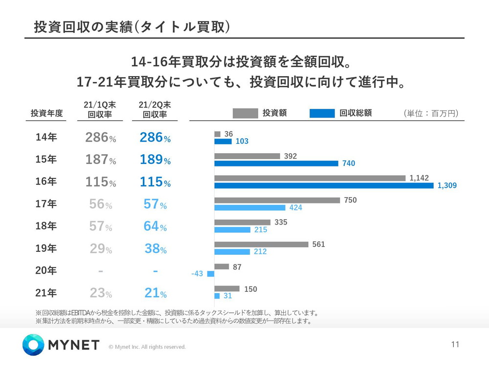 投資回収の実績は、タイトル買取型については、2014~2016年に買い取ったタイトルはすでに改修が完了しており、それ以降のタイトルについても投資回収に向けて進めているという。