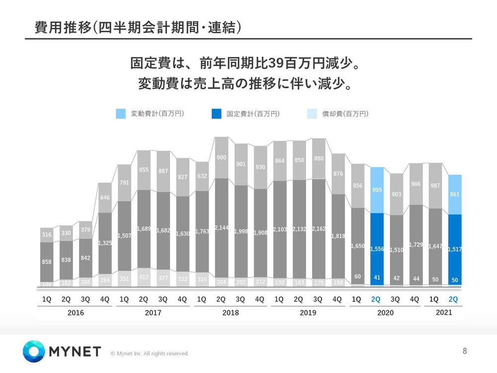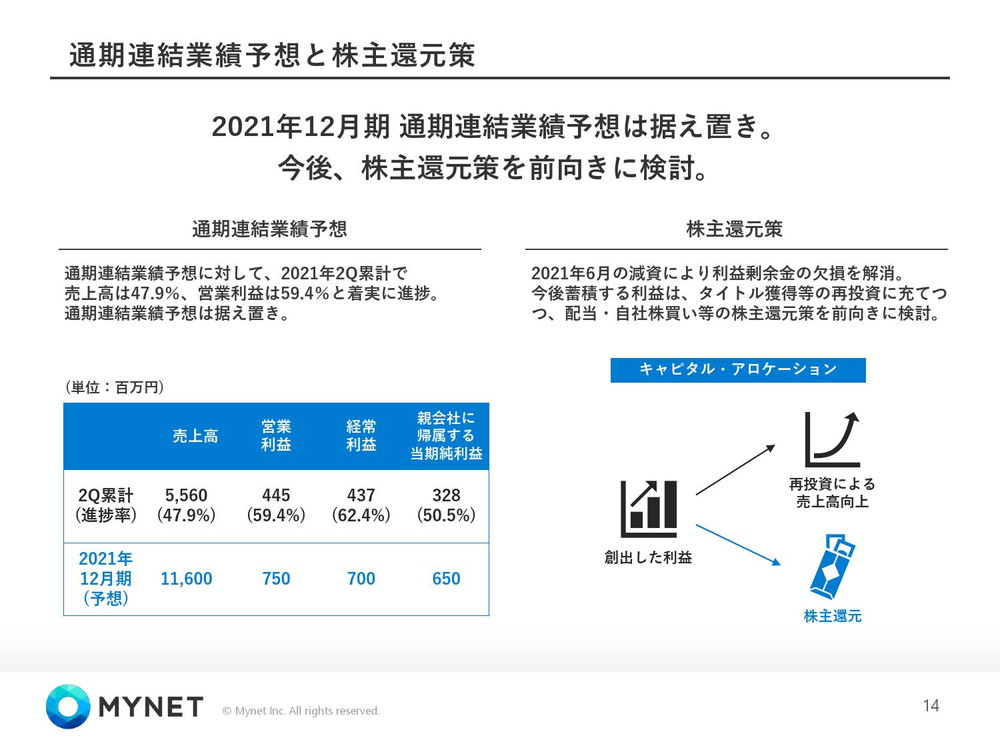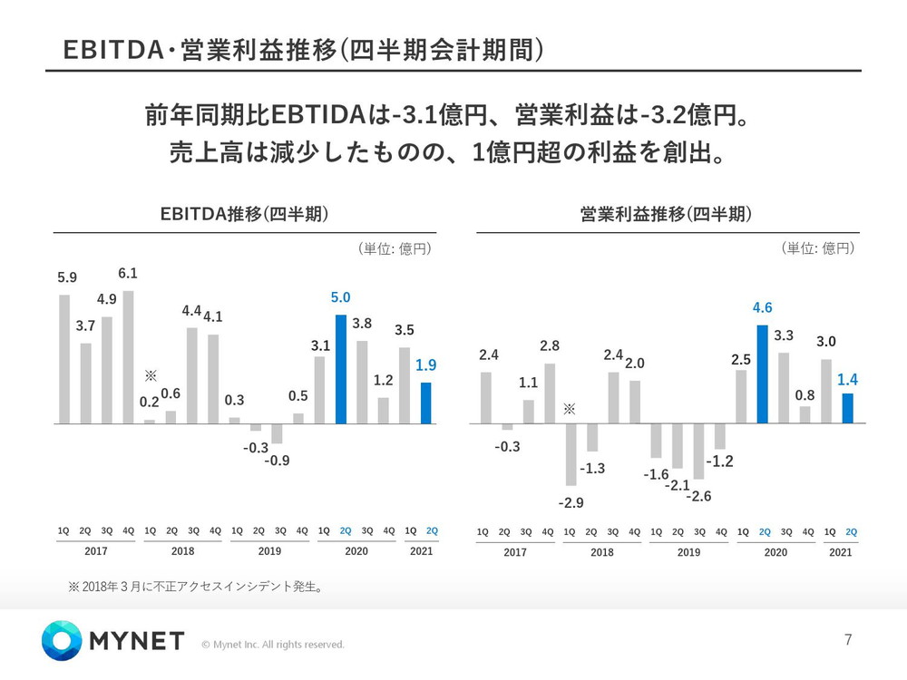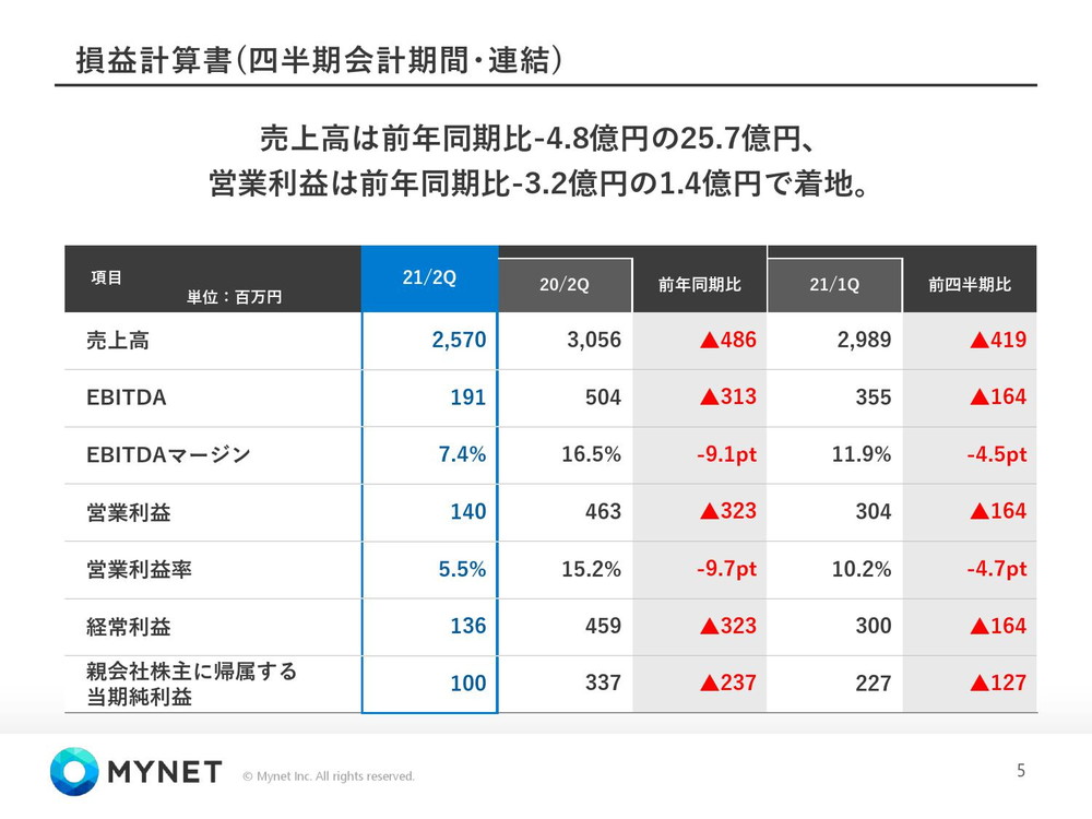 マイネット<3928>の第2四半期(21年4月~6月)の連結決算は、売上高25億7000万円(前年同期比15.9%減)、営業利益1億4000万円(同69.7%減)、経常利益1億3600万円(同70.3%減)、最終利益1億円(同70.3%減)だった。減収・減益となったものの、6四半期連続の黒字を達成した。