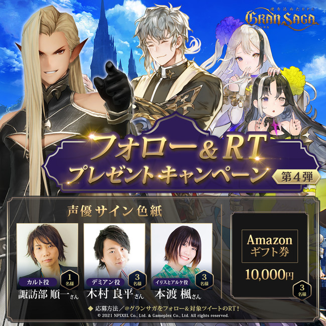 公式Twitterでは、 今回第4弾となる豪華声優陣のサイン入り色紙プレゼントキャンペーンを開催する。プレイアブルキャラクターの『カルト』を演じる諏訪部 順一さんや、 カルトのグランウェポンである『イリスとアルケ』を担当する本渡 楓さん、 『デミアン』を担当する木村 良平さんのサイン入り色紙となる。