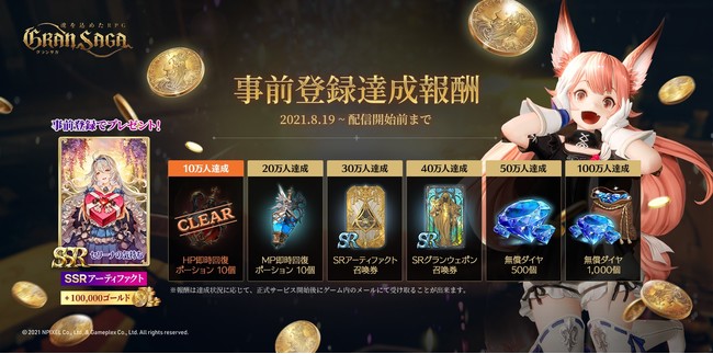 『 グランサガ (Gran Saga) 』の事前登録者数に応じて、 追加報酬が貰えるプレゼントキャンペーンを実施している。達成人数に応じて追加報酬の内容も豪華になりますので、 事前登録がお済みでない人は是非登録の上、 グランサガのリリースを楽しみに待とう。