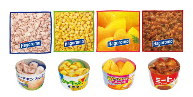 「シーチキン」「シャキッと!コーン」「朝からフルーツ」「ミートソース」の中身がデザインされたハンドタオル。 全4種類。縦約20cm×横約20cm。