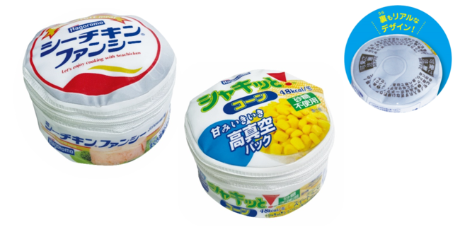 「シーチキン」「シャキッと!コーン」の缶パッケージをデザインした小物が入るポーチ。 裏面は缶蓋をリアルに再現。 全2種類。直径約10cm×厚み約5.6cm。