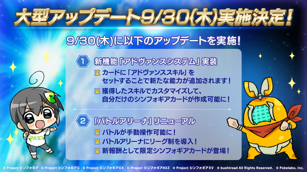 大型アップデートの実施日が9月30日に決定した。今回のアップデート内容は新機能「アドヴァンスシステム」の実装や、「バトルアリーナ」リニューアルなどを予定している。