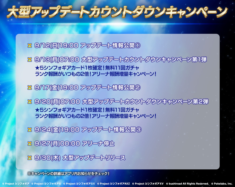 大型アップデートに先駆けて9月12日よりアップデート情報の公開や、9月13日からは「大型アップデートカウントダウンキャンペーン第1弾」などを順次実施予定。大型アップデートカウントダウンキャンペーンでは、★5 シンフォギアカードが1枚確定となる「無料11回ガチャ」をはじめ、アリーナ報酬増量キャンペーンに加えログインボーナスも実施される。