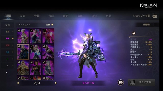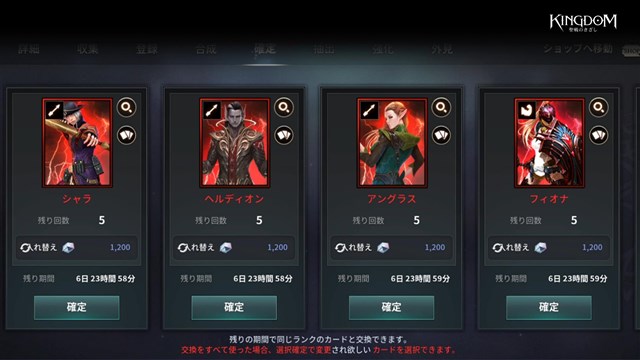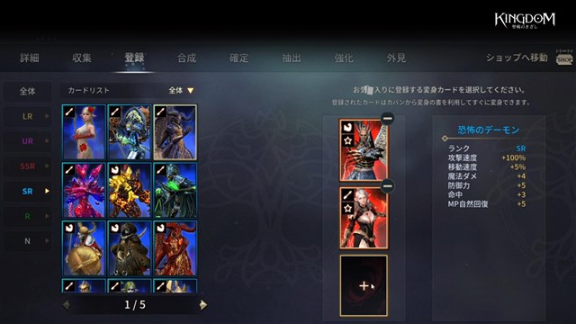 『KINGDOM』ではプレイヤーが入手した変身カードを使うことで、英雄やモンスターなどに変身して戦うことができる。変身することで性別や容姿だけでなく、カードごとの性能に応じてステータスも変化する。見た目で気に入った変身カードでプレイしたり、敵やコンテンツに応じて変身カードを使い分けるなど、幅広い使い方ができる。