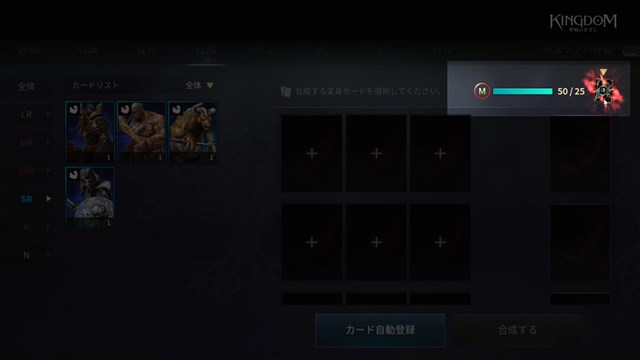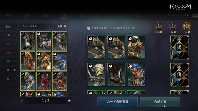 同じカードを1枚以上入手した場合は、余った変身カード3枚を合成させることで、同じランクもしくは1つ上のランクの変身カードを入手できる。
