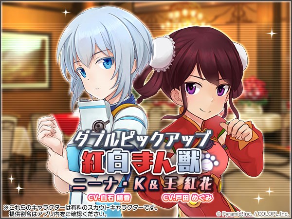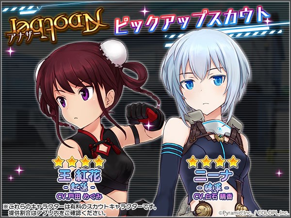また、追加されたメインストーリーに登場する「ニーナ・K(CV:白石 晴香)」と「王 紅花(CV:戸田 めぐみ)」の、計2名の★4キャラクターを<ダブルピックアップ>したスカウトが登場している。