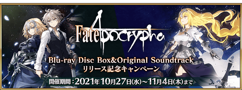 本キャンペーンは、TV アニメ「Fate/Apocrypha」の Blu-ray Disc Box Standard Edition と Original Soundtrackが 10 月 27 日に同時発売することを記念して開催するキャンペーンとなっている。