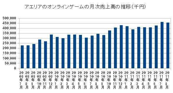 アエリア<3758>は、本日(9月7日)、8月の北米・南米、欧州、日本におけるオンラインゲーム事業の業績速報を発表し、売上高は前年同月比32.8%増の4億5700万円だった。7月の水準には及ばなかったものの、同社としては過去2番目の売上規模となる。
