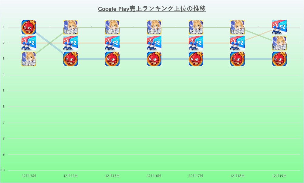 上位陣では、4位にスクウェア・エニックスとアカツキ<3932>の『ロマンシング サガ リ・ユニバース』が前日の104位から急上昇してきた。『ロマサガRS』は、12月6日12時より、「祝!12月6日で3周年!Romancing祭 2021」や「祝!12月6日で3周年!Ultra DXガチャ」など3周年を記念した複数のガチャ施策を展開していることが売上に大きく寄与しているようだ。