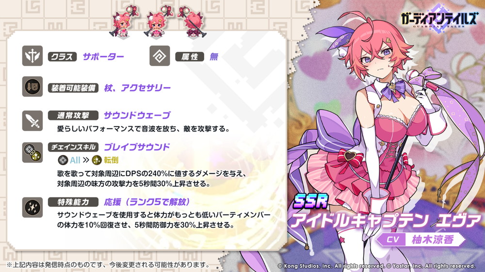 現在、SSR 英雄「アイドルキャプテン エヴァ(CV:柚木涼香)」、★5 装備「杖 エンジェルボイス」のピックアップ召喚が開催中。
