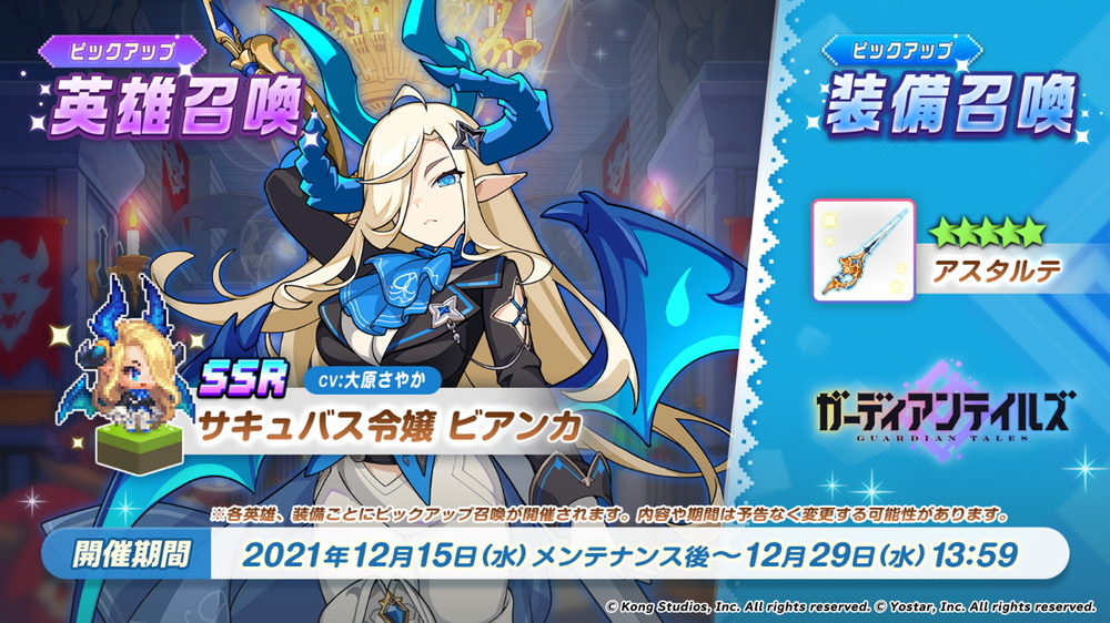 現在、SSR 英雄「サキュバス令嬢 ビアンカ(CV:大原さやか)」、★5 装備「両手剣 アスタルテ」のピックアップ召喚が開催中。