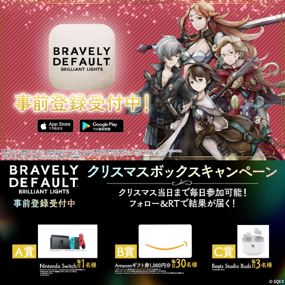 スクウェア・エニックスは、事前登録受付中の『ブレイブリーデフォルト ブリリアントライツ』(BRAVELY DEFAULT BRILLIANT LIGHTS、以下『BDBL』)において、現在Twitter Japan社が主催する「#クリスマスボックス キャンペーン」に参加している。BDBLの公式Twitterアカウントをフォローし、公式Twitterアカウントから投稿されるキャンペーン対象ツイートをリツイートした方の中から、抽選で合計700名以上の方に、Nintendo SwitchやAmazonギフト券(1000円分)などの豪華賞品をプレゼントしている。