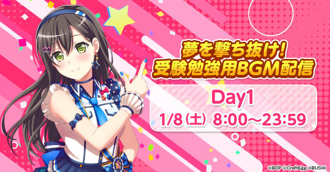 ブシロード<7803>とCraft Eggは、『バンドリ! ガールズバンドパーティ!』(『ガルパ』)において、昨今のコロナ禍で不安も大きい中、 受験にチャレンジする学生を応援したいという思いを込めて、1月7日(金)12時より、イラストと音楽で受験生を応援する「夢を撃ち抜け!受験生応援キャンペーン!2022」を開始した。