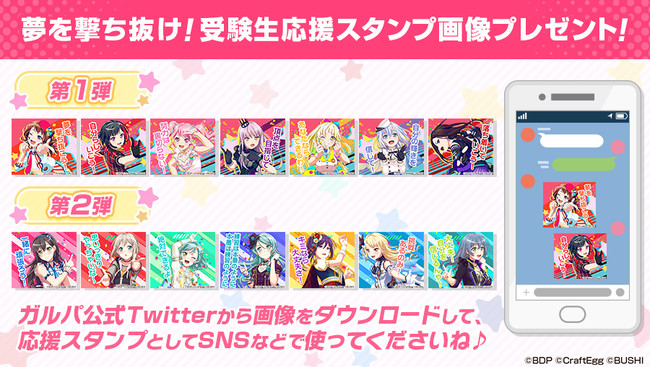さらに、 SNSなどで使える「夢を撃ち抜け!受験生応援スタンプ画像」を、 ガルパ公式Twitter(@bang_dream_gbp)上にて無料配布いたします。