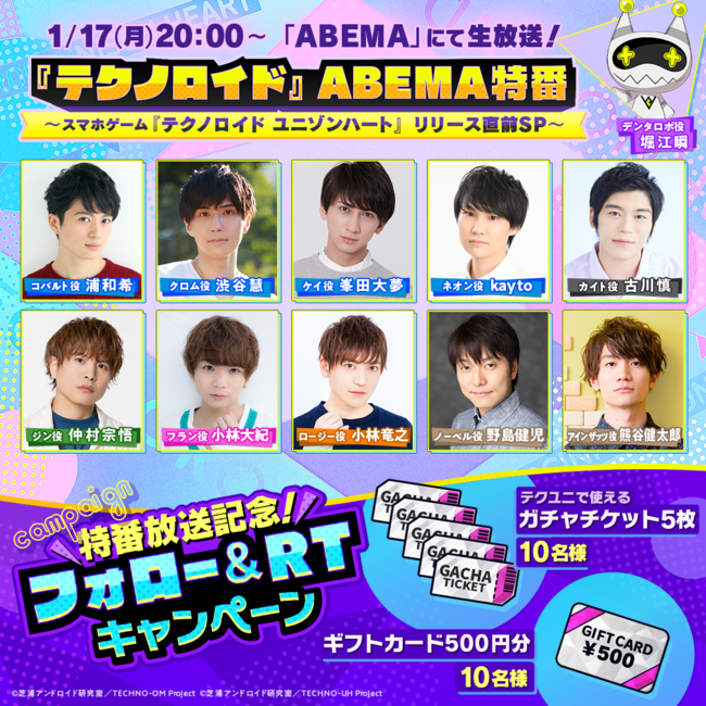 公式Twitterにて、 「『テクノロイド』ABEMA特番~スマホゲーム『テクノロイド ユニゾンハート』リリース直前SP~」の放送を記念して、 フォロー&RTプレゼントキャンペーンを実施いたします。