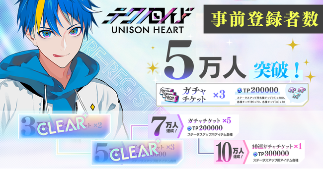 放送を記念し、 本日よりゲームガチャチケットなどが当たるプレゼントキャンペーンを実施。 また、 この度、 『テクノロイド ユニゾンハート』の事前登録者が5万人を突破した。 ガチャチケット×3、 TP200,000、 ステータスアップ用各種チップ(小)×100、 (中)×70、 (大)×30がゲームリリース時にプレゼントされる。