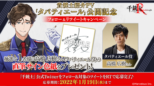 PV公開を記念して、 『千銃士』公式Twitterアカウントでは高橋広樹さん(タバティエール役)の直筆サイン色紙が当たるフォロー&リツイートキャンペーンを開催しております。 応募の締切は2022年1月19日(水)23:59まで!奮ってご応募くださいませ!
