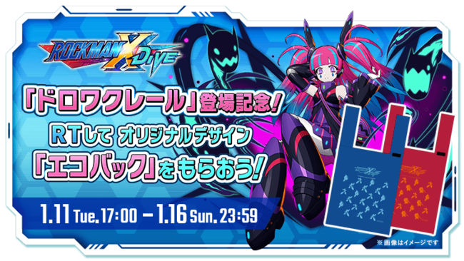 1月16日(日)23:59まで、 ドロワクレール登場記念キャンペーンを開催!「ロックマンX DiVE」公式ツイッター(@RX_DiVE)をフォローし、 キャンペーン期間中に指定されたツイートをRTした中から抽選で20名に 「ロックマンX DiVE オリジナルデザインエコバッグ」をプレゼント。