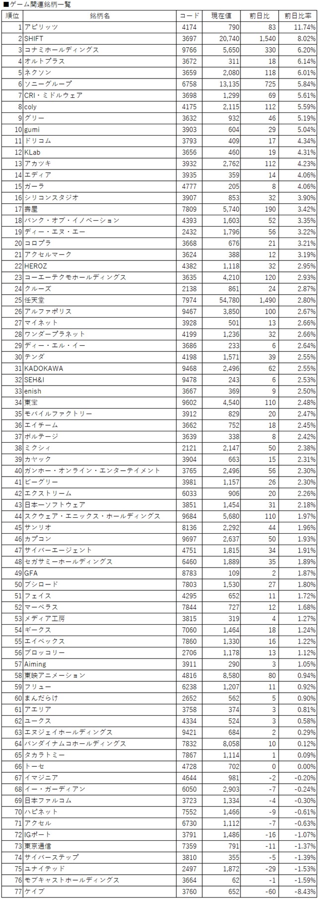 また、前日の流れを引き継ぎ、コナミHD<9766>など大手ゲーム株が市場再編への思惑から物色対象となった。