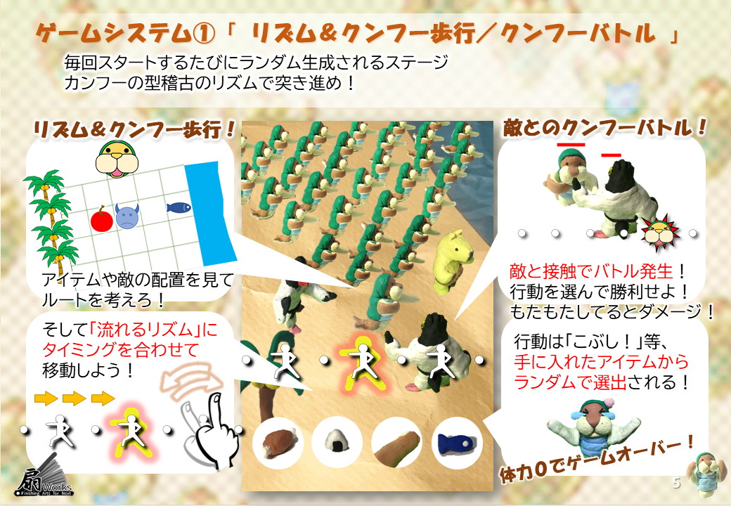 【概要】「ローグライト風 縦スクロールリズム RPG」。ステージを進めていくと仲間がどんどん増えていくというシステム。愛らしいクンフージュゴンを生き生きと描くために、手作り感をコンセプトに世界観をデザインしている。