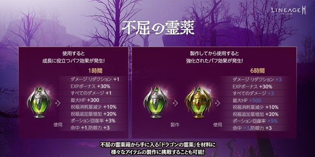 「不屈の霊薬箱」から獲得できる「ドラゴンの霊薬」は、 使用することで「ダメージ リダクション」や「EXP ボーナス」を一定時間向上できるほか、 製作の材料としても使用することができる。 この「不屈の霊薬箱」を含む特別なパッケージも、 本日同時に登場した。