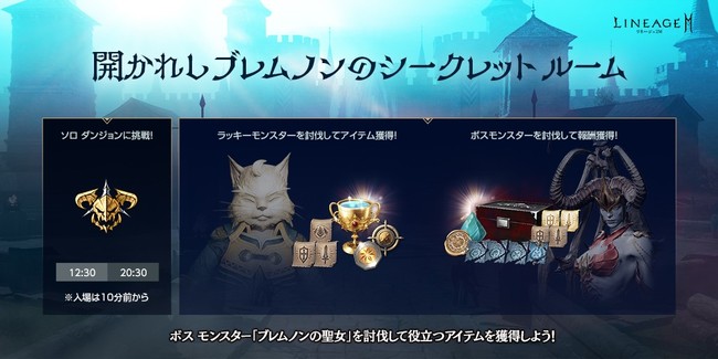 期間中、 毎日12時30分と20時30分に、 1名のみで参加できるダンジョン「ブレムノンのシークレット ルーム」が出現する。ダンジョン内では、 冒険に役立つ様々なアイテムを獲得することができる。