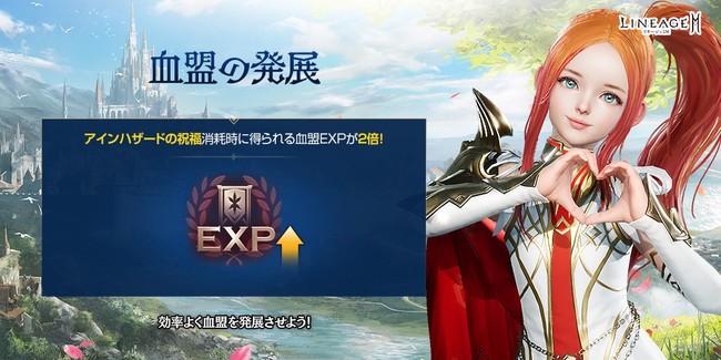 期間中、 「アインハザードの祝福」を消耗した時に獲得できる血盟EXPが2倍となる。この機会にたくさんのモンスターを討伐して、 血盟レベルを上げよう。