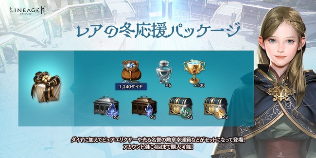 期間限定で、 1,240ダイヤと「光る名誉の勲章幸運箱(刻印)」3個や「光る啓示の証幸運箱(刻印)」3個、 「ピュアエリクサー(刻印)」5個などが入った「レアの冬応援パッケージ」が登場。1アカウントにつき4回まで購入することができる。