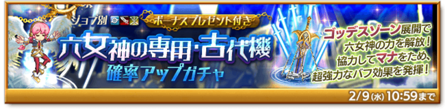 期間中、 「ジョブ別 六女神の専用・古代機確率アップガチャ」を販売する。「六女神の専用武器・古代機」シリーズが確率アップ!必殺スキルで「ゴッデスゾーン」を展開し、 仲間と共にためた「マナ」を消費して強力な覚醒スキルを放て!
