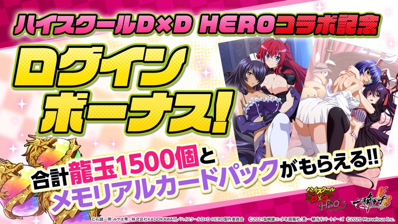 人気アニメ「ハイスクール D×D HERO」とのコラボイベントの開催を記念して特別なログインボーナスを開催!限定メモリアルカードが貰えるほか、期間中合計でガチャ10回分の龍玉がもらえる。