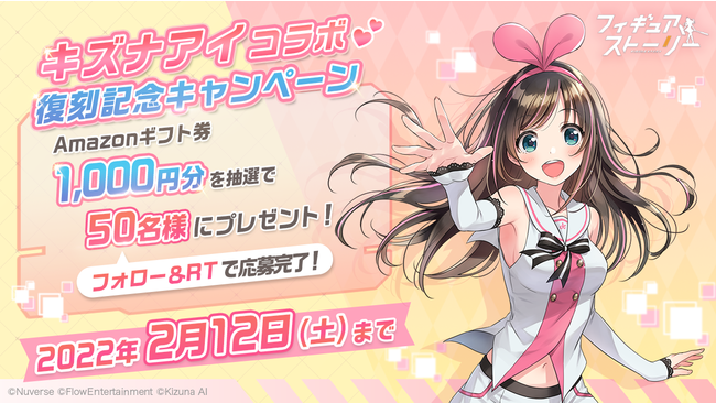 Nuverseは、運営するスマートフォン向け“フィギュアRPG”『フィギュアストーリー(以下ギアスト)』において、 昨年6月に開催した、 人気バーチャルタレント「キズナアイ」さんとのコラボレーションイベントを、 2月6日(日)から復刻開催することを発表した。また、 これを記念して、 Twitter上でAmazonギフト券が抽選で当たるキャンペーンを行う。