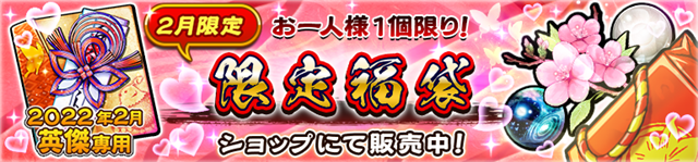 当月に開催されるイベント「【秘湯郷の地獄巡り】特効! 英傑 縁結び」で使用できる「【御朱印付き】 2月・英傑結糸(10回)」を1個と、キャラクターの強化に必要なアイテムがまとめて手に入るお得なセット。
