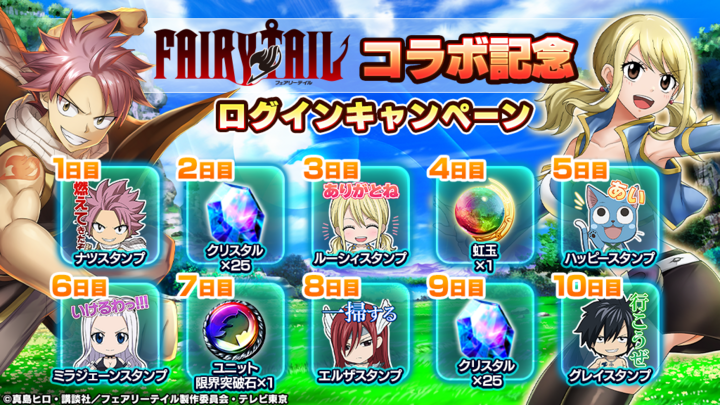 1月31日メンテナンス終了後より、クリスタル50個や、オリジナルスタンプがもらえる『FAIRY TAILコラボ記念ログインキャンペーン』を開催中。毎日ログインしてすべての報酬を獲得しよう。