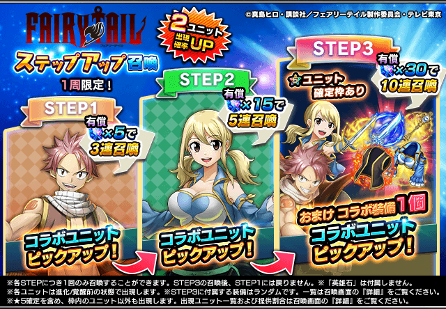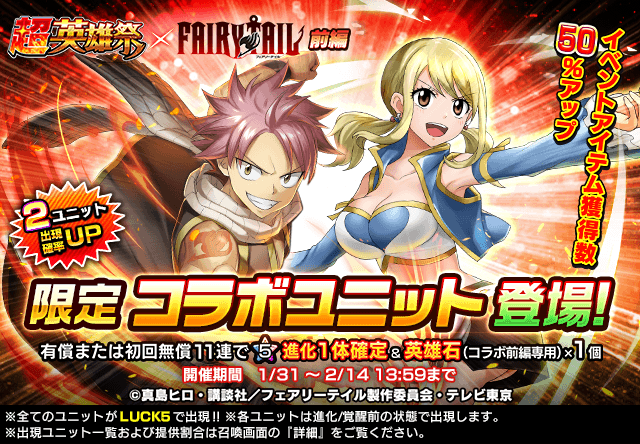 1月31日メンテナンス終了後より、『ナツ・ドラグニル(CV.柿原徹也)』『ルーシィ・ハートフィリア(CV.平野綾)』が登場する『超英雄祭×FAIRY TAIL』前編を開催中。ド派手なドットアニメーションはもちろん、魅力的で強力なユニット性能にも注目。『FAIRY TAIL ステップアップ召喚』も登場!最終ステップでは★5ユニットの排出が確定するほか、コラボ装備も1つおまけで入手できる。