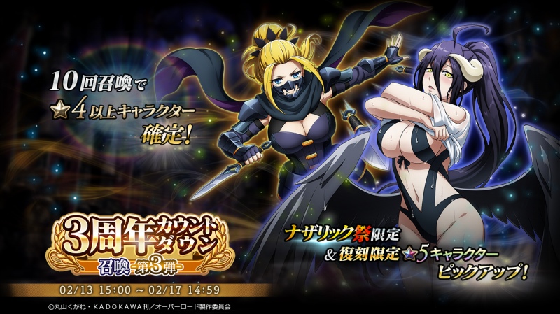 一人3回かぎりの3周年カウントダウン召喚第2弾-。初回は混沌石100個!ステップ2は混沌石が300個で利用できるお得な召喚。ステップ3でナザリック祭限定★5キャラクター&復刻★5キャラクターが確定で排出。