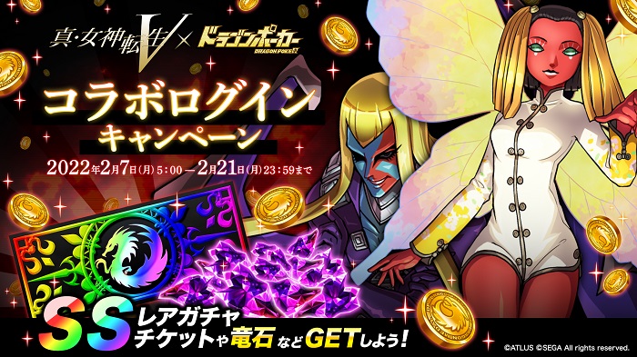 アソビズムは、『ドラゴンポーカー』において、2022 年 2 月 7 日(月)メンテ後より『真・女神転生Ⅴ』とのコラボイベントを開催する。
