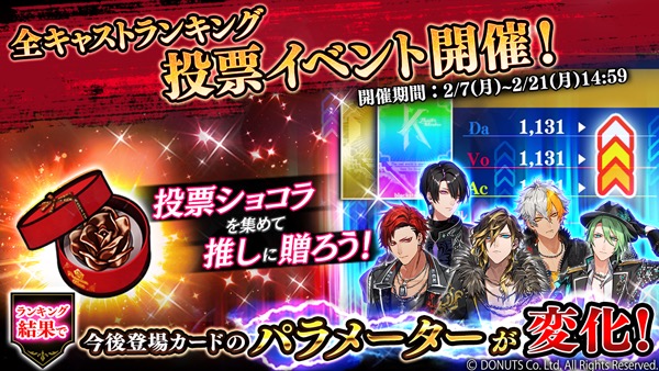 投票アイテム「バレンタインショコラ」をキャストに贈ることで、 キャストは投票ptを獲得でき、 ポイントが大きい方が順位が高くなる。